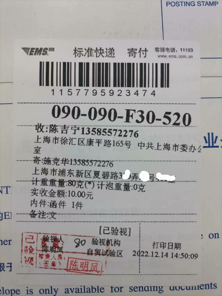 2022年12月14日致中共上海市委书记市委陈吉宁信访书的邮寄凭证(EMS:1157795923474)
