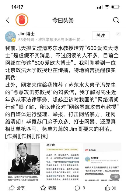 Jim博士一路打过来还没有阻力。攻击陈春花、苏东水,没有遇到反抗,谁敢出头就攻击谁,他对苏门弟子的情况是有研究的。或许,冯正虎是另类的苏门弟子,二十几年不在苏门圈子里,无人知晓冯与苏东水的师生关系。冯不受国内网络控制,不依附国内网络平台,有自己独立发声的平台,在海外中文社交媒体平台上也有影响力。