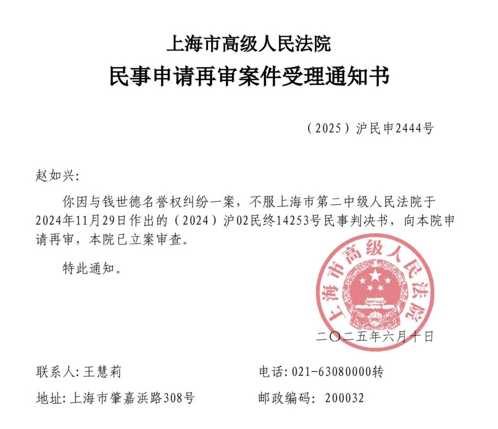 7月8日,赵如兴收到上海市高级人民法院6月6日作出的《民事申请再审案件受理通知书》,案号为(2025)沪民申2444号。这是赵如兴对上海司法公正的期盼。