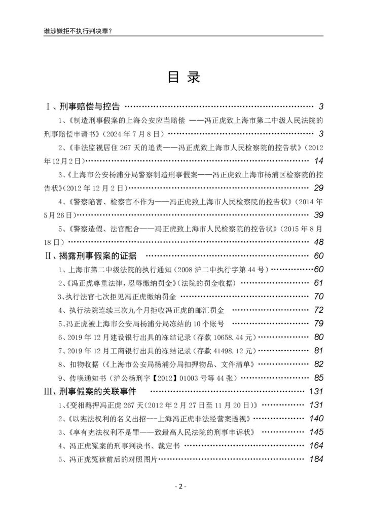 冯正虎将所有与这起假案相关的材料汇编成册《谁涉嫌拒不执行判决罪?——剖析上海警察制造的刑事假案》,请国家监察部门、上级公检法的领导机关及公众明断,督促司法公正,捍卫法律,制止黑恶势力,保障人权。