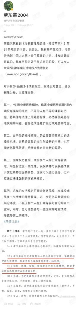另外,每个人对“民族精神、民族感情”理解会有很大差别。如果把界定“民族精神、民族感情”的权力交给基层治安民警,则会出现大量的不可预测性,那么会对公民和执法人员造成严重困扰,最终损害法律的权威性。