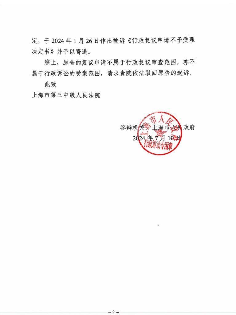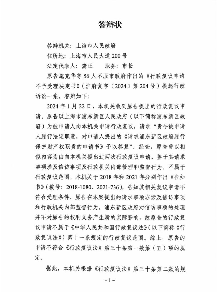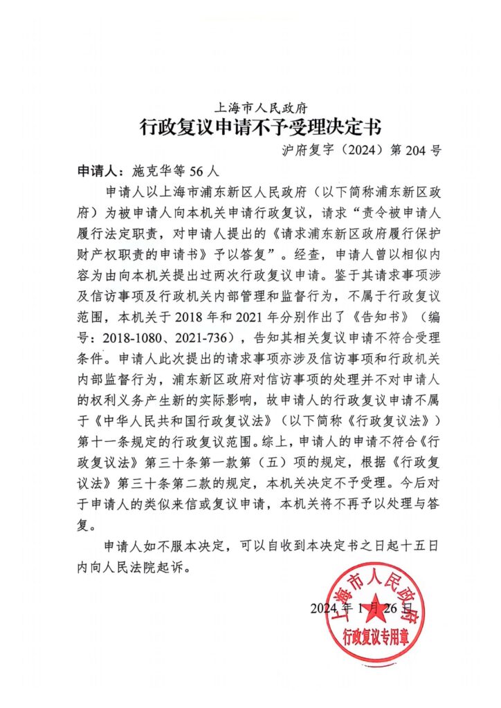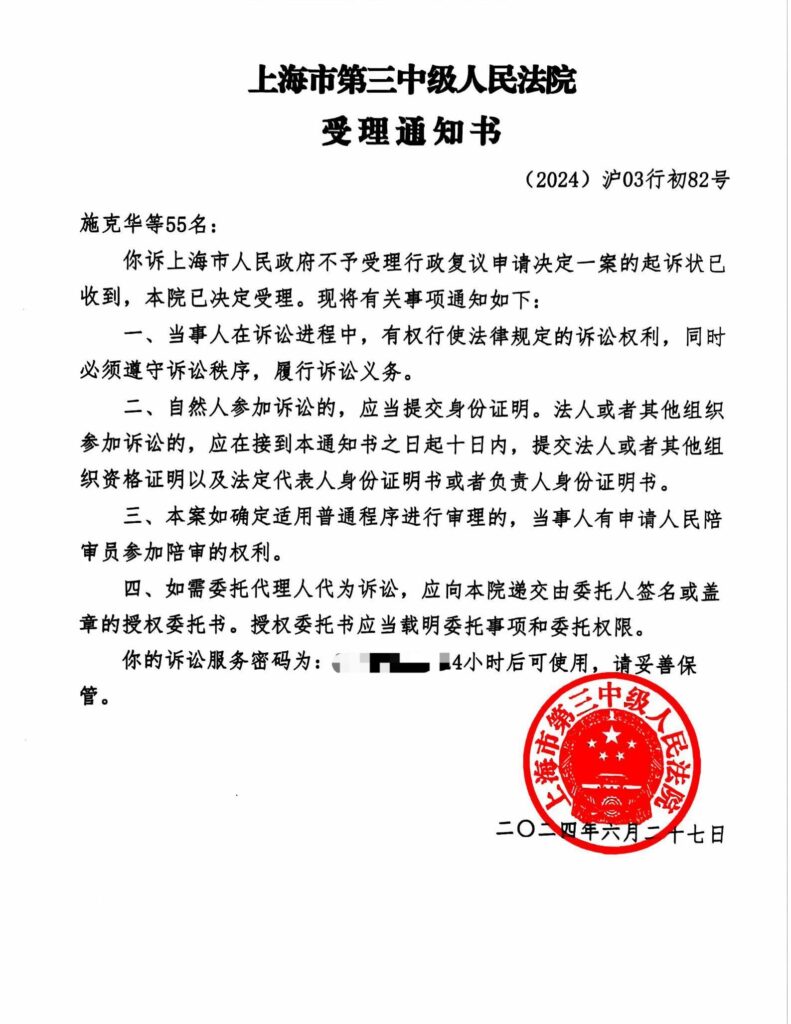 2024年6月27日,上海市第三中级人民法院正式受理了上海市浦东新区55名失地农民诉上海市人民政府行政复议不予受理决定一案。案号:(2024)沪03行初82号